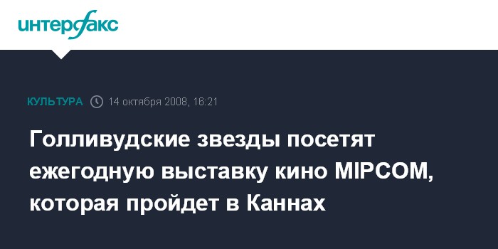 Москва. 14 октября. INTERFAX.RU - В середине следующего месяца в французском городе Канны пройдет 24-я ежегодная выставка MIPCOM на которую съедутся звезды звезды мирового кино и телевидения. Она пройдет 13-17 октября во Дворце кинофестивалей.