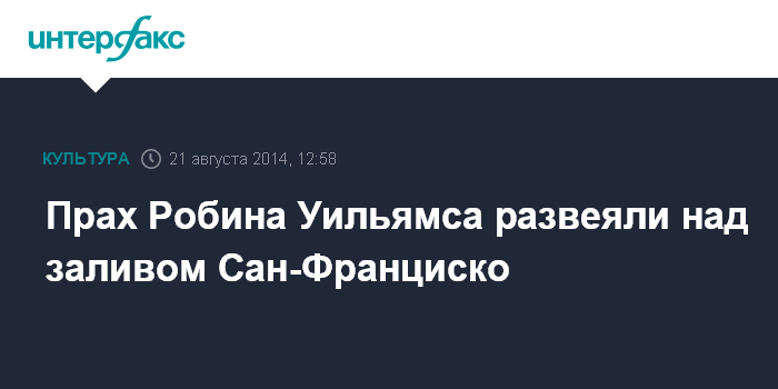 Москва. 21 августа. INTERFAX.RU - Родственники покончившего жизнь самоубийством актера Робина Уильямса развеяли его прах над заливом Сан-Франциско, сообщает в четверг New York Daily News.