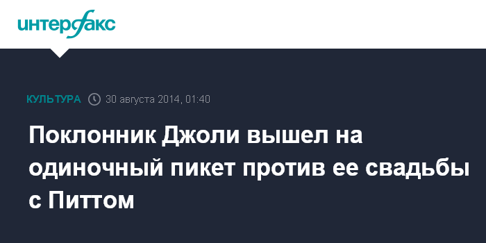 Москва. 30 августа. INTERFAX.RU - Поклонник актрисы Анджелины Джоли в пятницу вышел в Венеции на одиночный пикет, протестуя против ее свадьбы с актером Брэдом Питтом. Об этом с 71-го Венецианского фестиваля сообщает корреспондент "Интерфакса".