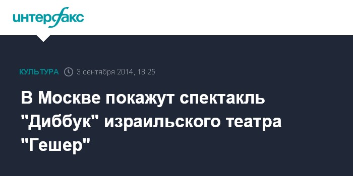 Москва. 3 сентября. INTERFAX.RU - Израильский театр "Гешер" при поддержке посольства этой страны в России 18-20 сентября представит в Москве свой спектакль "Диббук" в постановке Евгения Арье. Об этом говорится в пресс-релизе посольства Израиля в Москве, поступившем в "Интерфакс".