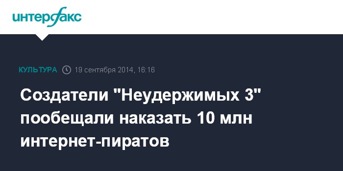 Москва. 19 сентября. INTERFAX.RU - Создатели фильма "Неудержимые 3" пригрозили привлечь к ответственности каждого из 10 млн человек, которые скачали картину на торрентах, сообщает Variety.