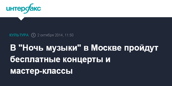 Москва. 2 октября. INTERFAX.RU - Бесплатные концерты и мастер-классы пройдут во вторую "Ночь музыки", которая состоится в Москве в субботу, 4 октября, сообщили "Интерфаксу" организаторы мероприятия. Акция начнется в 12 часов дня и закончится за полночь.
