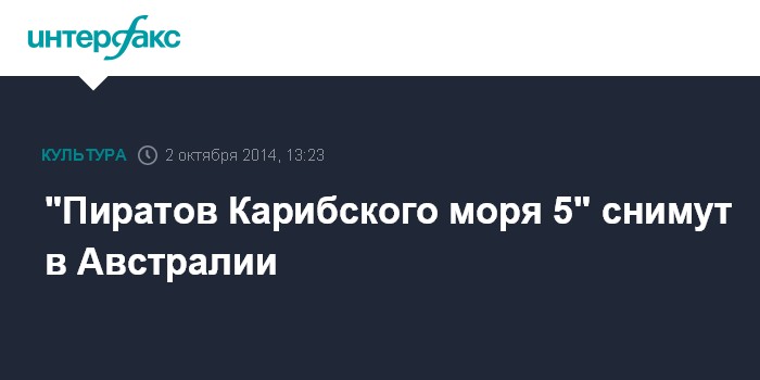 Москва. 2 октября. INTERFAX.RU - Съемки "Пиратов Карибского моря 5" пройдут в Австралии, сообщает The Hollywood Reporter со ссылкой на киностудию Disney, которая занимается производством фильма.