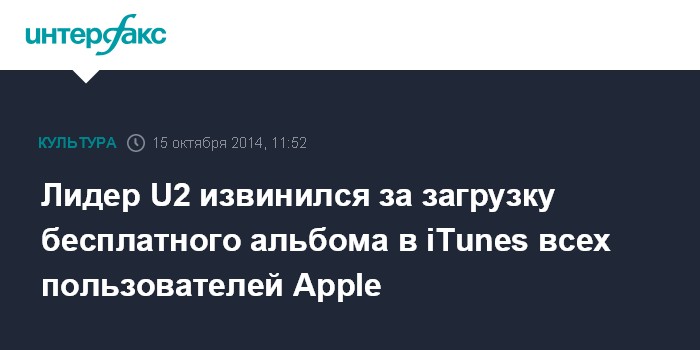 Москва. 15 октября. INTERFAX.RU - Лидер ирландской рок-группы U2 Пол Дэвид Хьюсон, известный также как Боно, извинился за добавление альбома "Songs of Innocence" в музыкальные библиотеки всех пользователей устройств от Apple. Это произошло во время записи видеоинтервью, в котором участники группы отвечали на вопросы пользователей фейсбука.