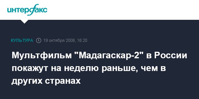 "В российском прокате мультфильм "Мадагаскар-2" стартует 30 октября - на неделю раньше, чем во всем мире", - говорится в пресс-релизе компании "Юниверсал Пикчерз Интернэшнл" (Россия).
