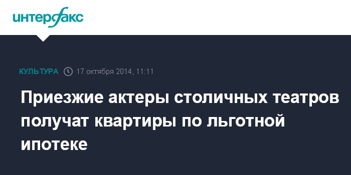 Москва. 17 октября. INTERFAX.RU - Приезжие актеры московских театров смогут получить квартиры по льготной ипотеке. Об этом M24.ru сообщил председатель "Столичного цеха деятелей культуры" при Мосгордуме, директор театра им. Владимира Маяковского Леонид Ошарин.