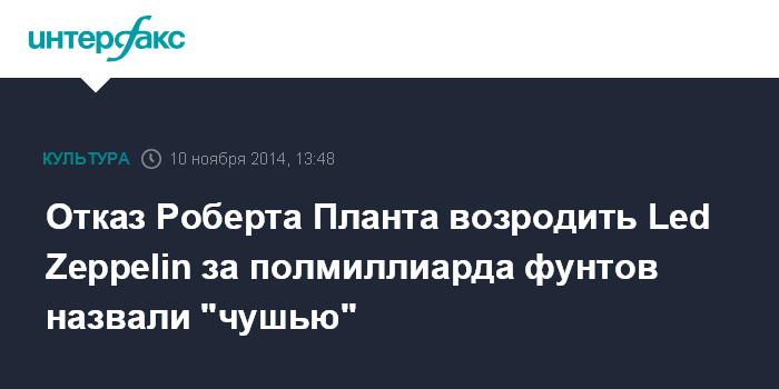 Москва. 10 ноября. INTERFAX.RU - Представитель бывшего вокалиста британской группы Led Zeppelin Роберта Планта назвал "чушью" сообщения о том, что музыкант отказался от многомиллионного контракта на временное воссоединение коллектива. Об этом пишет The Guardian. Более подробных комментариев не предоставляется.