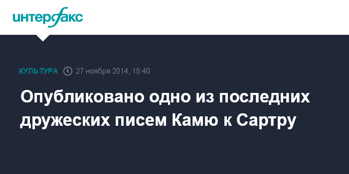 Москва. 27 ноября. INTERFAX.RU - Опубликовано письмо, которое французский писатель и философ Альбер Камю отправил своему коллеге Жан-Полю Сартру незадолго до того, как они разругались, сообщает The New York Times.