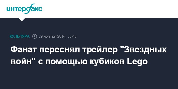 Москва. 29 ноября. INTERFAX.RU - Фанат серии "Звездных войн" переснял появившийся в пятницу трейлер нового фильма при помощи кубиков из конструктора Lego, сообщила газета The Daily Mail.