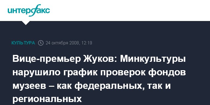 Москва. 24 октября. INTERFAX.RU - Министерство культуры России нарушило график проведения проверки сохранности культурных ценностей, находящихся в фондах музеев страны, заявляет вице-премьер Александр Жуков.
