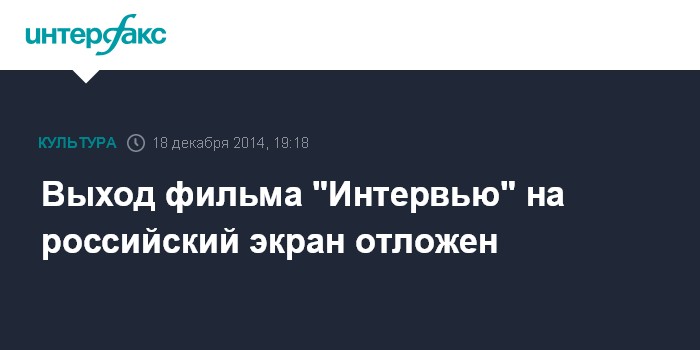 Москва. 18 декабря. INTERFAX.RU - Выход в прокат скандального американского фильма "Интервью" в России переносится на неопределенный срок, заявили в компании-прокатчике Walt Disney Studios Sony Pictures Releases (WDSSPR).