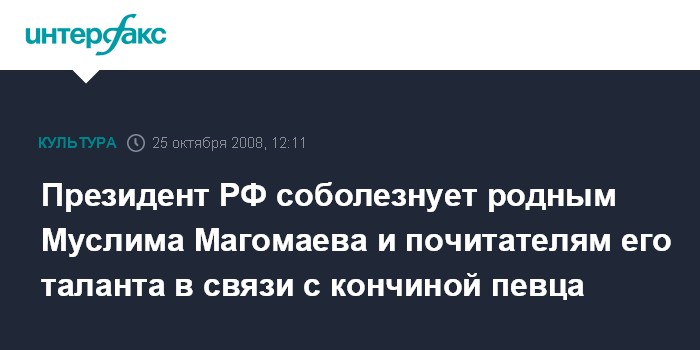 Москва. 25 октября. INTERFAX.RU - Президент России Дмитрий Медведев выразил глубокие и искренние соболезнования в связи с кончиной Муслима Магомаева его супруге, родным и близким, а также почитателям таланта артиста, сообщает пресс-служба Кремля.