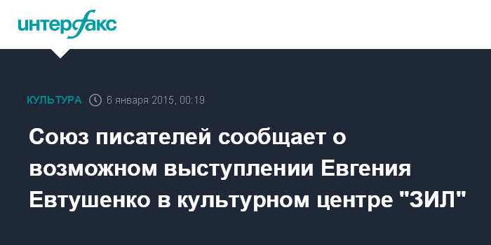 Союз писателей сообщает о возможном выступлении Евгения Евтушенко в культурном центре "ЗИЛ"