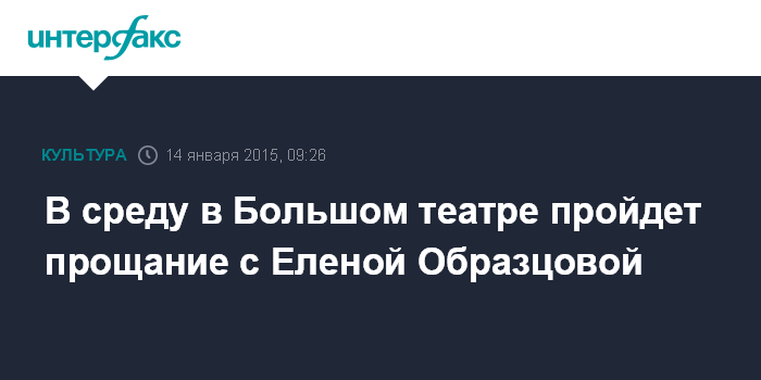 Москва. 14 января. INTERFAX.RU - Прощание с народной артисткой СССР Еленой Образцовой, скончавшейся 12 января, состоится в среду в Большом театре.