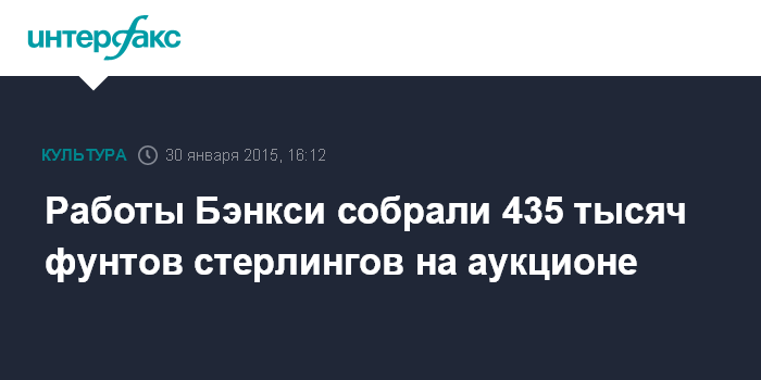 Москва. 30 января. INTERFAX.RU - Работы бристольского художника Бэнкси продали за 435 тысяч фунтов стерлингов ($655 тысяч) на аукционе в Лондоне, сообщает BBC News.