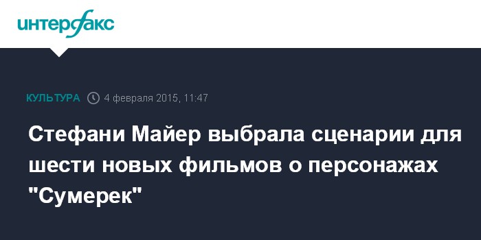 Москва. 4 февраля. INTERFAX.RU - Писательница Стефани Майер выбрала шесть сценариев, которые лягут в основу короткометражек про персонажей написанной ей саги "Сумерки", сообщает The Hollywood Reporter.