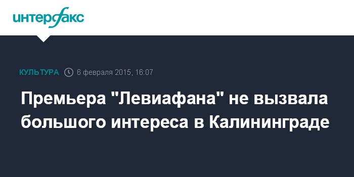 Москва. 6 февраля. INTERFAX.RU - Премьерный показ фильма "Левиафан" не вызвала большого интереса зрителей у зрителей Калининграда, сообщили "Интерфаксу" в нескольких кинотеатрах города.