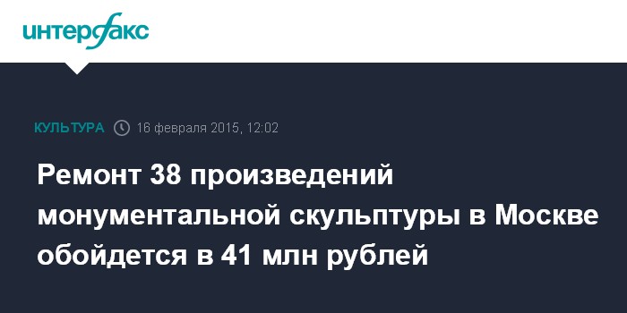 Москва. 16 февраля. INTERFAX.RU - В Москве отремонтируют 38 произведений современной монументальной скульптуры, не являющихся объектами культурного наследия. Электронный аукцион на проведение ремонта объявило ГКО "Мосреставрация".