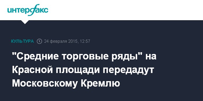 Москва. 24 февраля. INTERFAX.RU - Имущественный комплекс так называемых "Средних торговых рядов" будет передан в оперативное управление Государственному историко-культурному музею-заповеднику "Московский Кремль". Соответствующее распоряжение подписал президент РФ Владимир Путин.