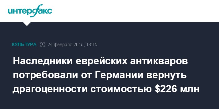 Москва. 24 февраля. INTERFAX.RU - Наследники еврейских антикваров обратились в американский суд с иском в отношении Германии и немецкого музея о возвращении средневековой сокровищницы, оцениваемой в $226 млн, сообщает агентство Associated Press.