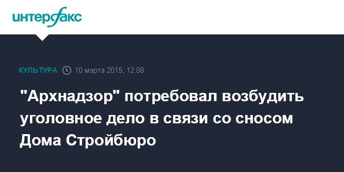 Москва. 10 марта. INTERFAX.RU - В градозащитном движении "Архнадзор" требуют возбудить уголовное дело в связи с уничтожением в подмосковном Королеве исторического Дома Стройбюро.