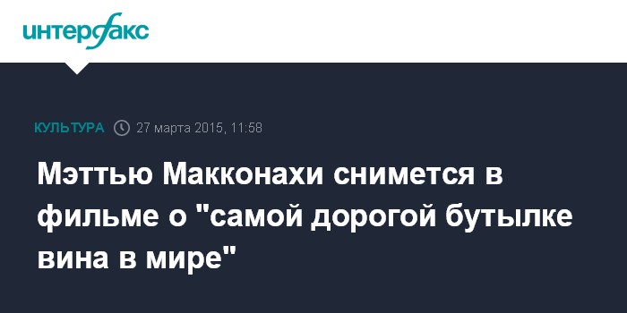 Москва. 27 марта. INTERFAX.RU - Мэттью Макконахи сыграет в экранизации книги Бенджамина Уоллеса "Уксус миллиардера: Тайна самой дорогой бутылки вина в мире", сообщает Deadline.