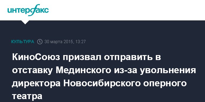 Москва. 30 марта. INTERFAX.RU - Альтернативный Союзу кинематографистов России КиноСоюз потребовал отставки министра культуры Владимира Мединского в связи с увольнением директора Новосибирского театра оперы и балета Бориса Мездрича.