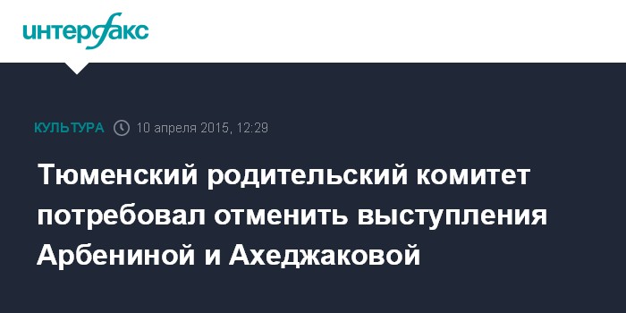 Москва. 10 апреля. INTERFAX.RU - Тюменский родительский комитет обратился к властям региона с просьбой оградить жителей области от выступления актрисы Лии Ахеджаковой и певицы Дианы Арбениной.