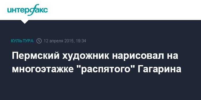 Москва. 12 апреля. INTERFAX.RU - Распятого на стальном кресте Юрия Гагарина изобразил на многоэтажке в Перми в ночь на воскресение местный художник Александр Жунев, о чем автор написал на своей страничке в социальной сети.