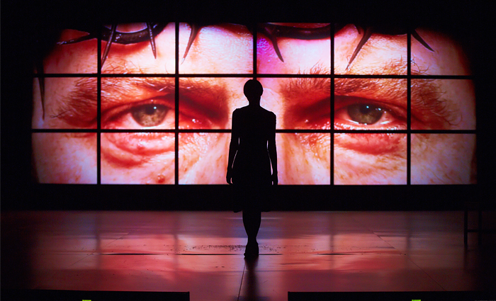 В течение всего действия с огромного экрана на героев и зрителей из-под воспаленных век смотрят глаза мужчины, на голову которого надет терновый венец. Человек глядит почти не моргая, и по его лицу постепенно начинают стекать капли крови. Присутствие всеми узнаваемого мученика, имя которого, впрочем, ни разу не упоминается, выводит и тему отцов и детей, и тему жертвенности на метауровень.