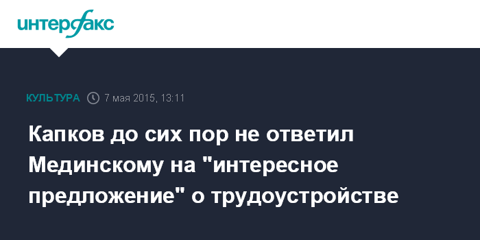 Москва. 7 мая. INTERFAX.RU - Экс-глава департамента культуры Москвы Сергей Капков пока не дал ответа на предложение о новой работе, которое ему сделал министр культуры РФ Владимир Мединский.