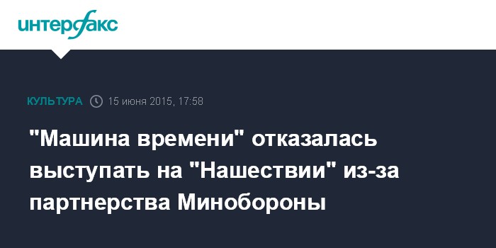 Москва. 15 июня. INTERFAX.RU - Группа "Машина времени" и ее лидер Андрей Макаревич отказались выступать на крупнейшем российском фестивале "Нашествие" из-за партнера мероприятия - Министерства обороны РФ - и выставки военной техники.
