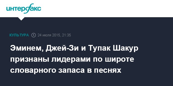 Москва. 24 июля. INTERFAX.RU - Американские рэперы Эминем, Джей-Зи и Тупак Шакур возглавляют список мировых исполнителей, использующих в своих песнях наибольший словарный запас, говорится в исследовании, проведенном базирующимся в Италии специализированным сайтом MusixMatch.