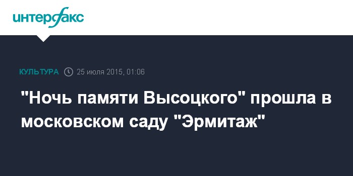 Москва. 25 июля. INTERFAX.RU - Сотни людей пришли в ночь на субботу в московский сад "Эрмитаж", чтобы поучаствовать в "Ночи памяти Высоцкого", приуроченной к 35-летию смерти артиста и организованной Театром на Таганке, передает корреспондент "Интерфакса".