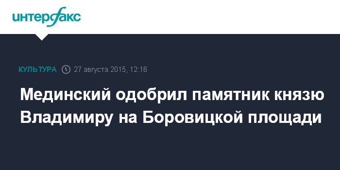 Москва. 27 августа. INTERFAX.RU - Министр культуры РФ Владимир Мединский выступил за установку памятника святому князю Владимиру на Боровицкой площади рядом с Кремлем.