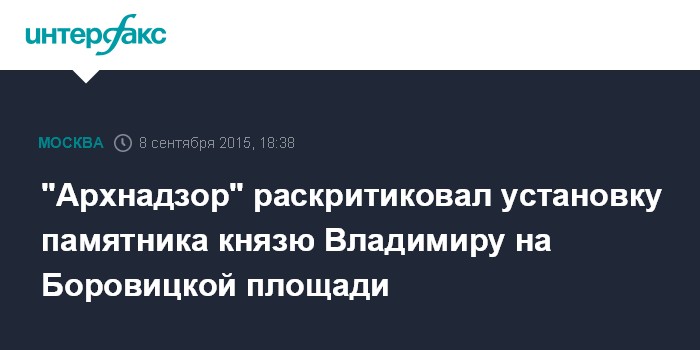 Москва. 8 сентября. INTERFAX.RU - В общественном движении "Архнадзор" сожалеют по поводу решения комиссии при Мосгордуме одобрить установку памятника крестителю Руси князю Владимиру на Боровицкой площади.