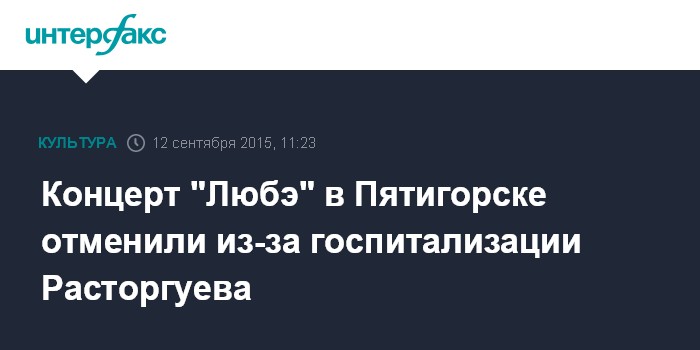 Москва. 12 сентября. INTERFAX.RU - Выступление группы "Любэ" на празднике к 235-летию Пятигорска (Ставропольский край) пришлось отменить из-за срочной госпитализации лидера коллектива Николая Расторгуева в Израиле, сообщает пресс-служба администрации города.
