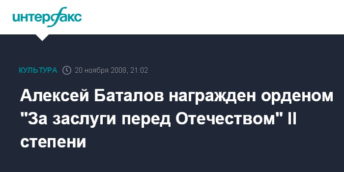 Москва. 20 ноября. INTERFAX.RU - Президент России Дмитрий Медведев подписал указ о награждении актера орденом "За заслуги перед Отечеством" II степени Народного артиста СССР Алексея Баталова.