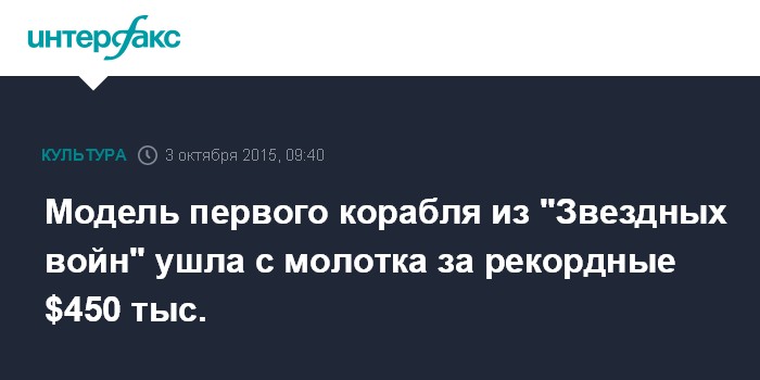 Москва. 3 октября. INTERFAX.RU - Модель космического корабля из "Звездных войн" продана с аукциона в Калифорнии за рекордную сумму в $450 тыс. Об этом сообщает организатор торгов – аукционный дом Profiles in History.