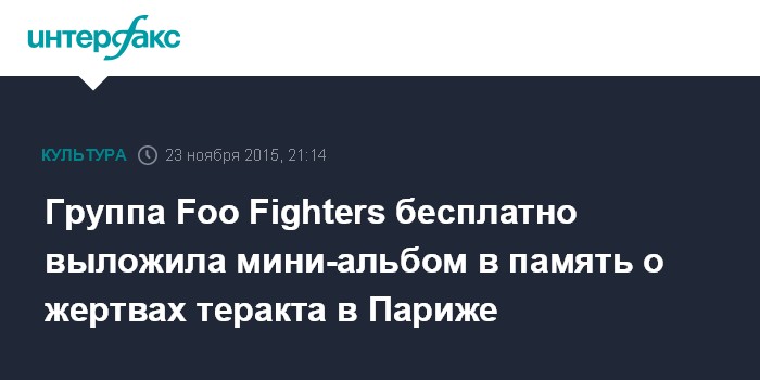 Москва. 23 ноября. INTERFAX.RU - Американская альтернативная рок-группа Foo Fighters бесплатно выложила в сеть новый мини-альбом Saint Cecilia в память о жертвах терактов в Париже, пишет в понедельник журнал The Rolling Stone.
