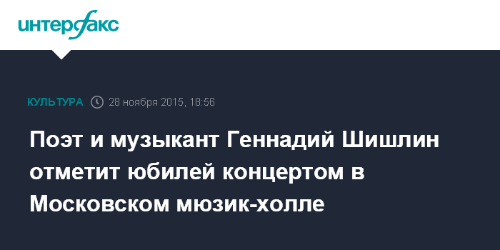 Москва. 28 ноября. INTERFAX.RU - Известный московский музыкант, заслуженный артист России Геннадий Шишлин выступит 3 декабря в Государственном московском мюзик-холле с юбилейным концертом "Моя русская Родина".