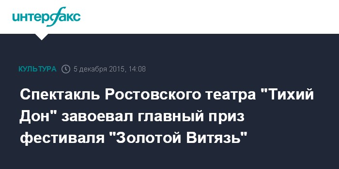 Москва. 5 декабря. INTERFAX.RU - Спектакль "Тихий Дон", поставленный на сцене Ростовского драматического театра имени Горького, завоевал главный приз 13-го Международного театрального фестиваля "Золотой Витязь", сообщил в субботу "Интерфаксу" художественный руководитель театра, заслуженный деятель искусств России Александр Пудин.