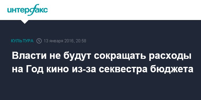 "Секвестр бюджета не затронет расходы Минкультуры России на кинематографию, которая в Год кино будет профинансирована в полном объеме", - цитирует пресс-служба директора департамента кинематографии Вячеслава Тельнова.
