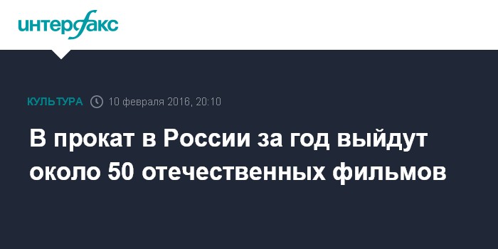 Москва. 10 февраля. INTERFAX.RU - В 2016 году в прокат в России выйдут 50 отечественных картин, сообщил исполнительный директор Федерального фонда социальной и экономической поддержки отечественной кинематографии Антон Малышев.
