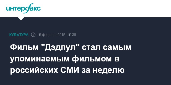 Москва. 16 февраля. INTERFAX.RU - Фильм "Дэдпул", установивший рекорд по кассовым сборам первого уикэнда, стал, по данным системы "СКАН", самым часто упоминаемым в российских СМИ фильмом за период с 8 по 16 февраля.