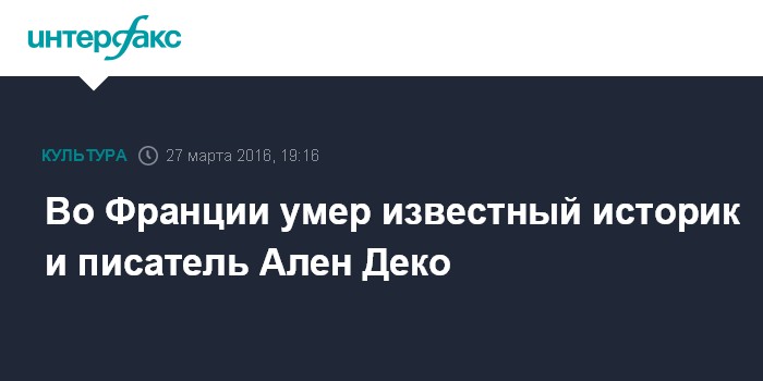 Москва. 27 марта. INTERFAX.RU - Известный французский историк, писатель и телеведущий Ален Деко скончался в возрасте 90 лет, сообщает в воскресенье сайт газета Le Figaro.
