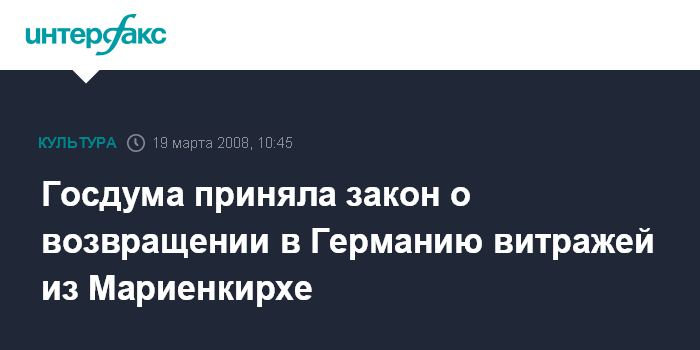 Москва. 19 марта. INTERFAX.RU - Госдума приняла сегодня сразу во втором и третьем чтениях законопроект "О передаче Федеративной Республике Германия витражей из церкви Святой Марии (Мариенкирхе) в городе Франкфурте-на-Одере, перемещенных в Союз ССР в результате Второй мировой войны и хранящихся в Государственном Музее изобразительных искусств имени А.С. Пушкина".