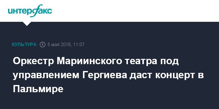 Москва. 5 мая. INTERFAX.RU - Симфонический оркестр Мариинского театра под управлением народного артиста России Валерия Гергиева в четверг даст концерт "С молитвой о Пальмире. Музыка оживляет древние стены" на площадке всемирно известного амфитеатра сирийской Пальмиры, сообщили в Мариинском театре.