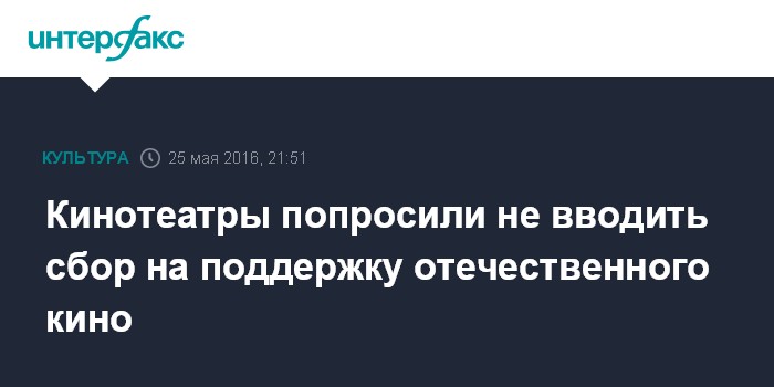 Москва. 25 мая. INTERFAX.RU - Крупнейшие российские сети кинотеатров направили письмо в правительство с просьбой не вводить новый сбор на поддержку отечественных фильмов, сообщила пресс-служба сети "Синема парк". Предложение поддержали "Каро фильм", "Киномакс", "Люксор" и "Формула кино", отмечается в сообщении.