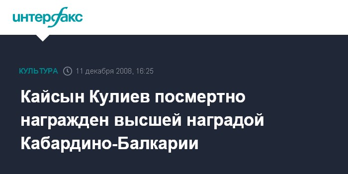 Москва. 11 декабря. INTERFAX.RU - Выдающийся балкарский поэт Кайсын Кулиев посмертно награжден высшей наградой региона - нагрудным знаком "За заслуги перед Кабардино-Балкарской республикой".